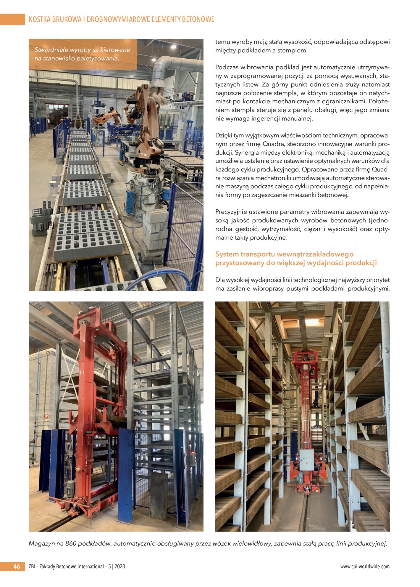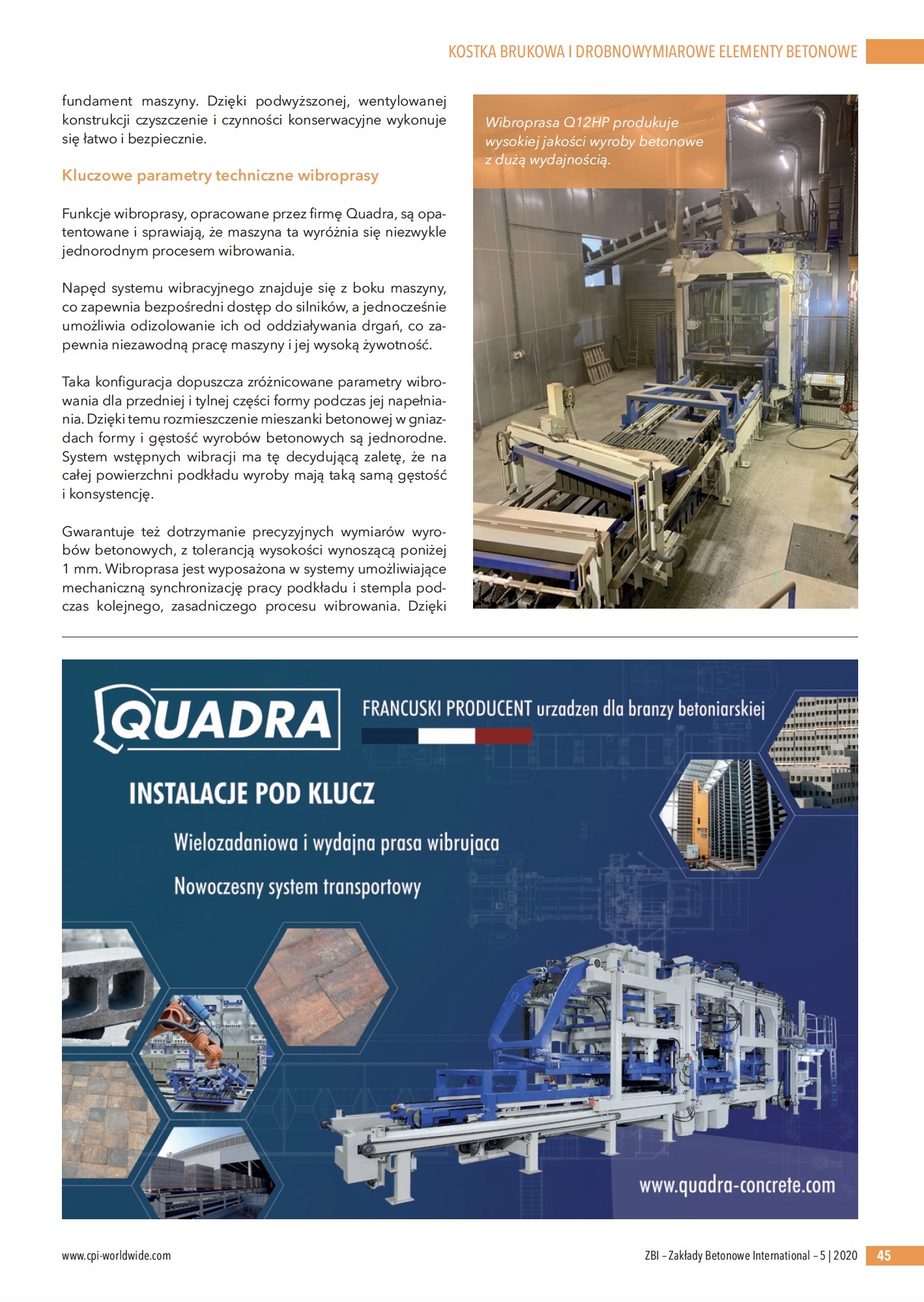 Sercem linii technologicznej w nowym zakładzie jest wibroprasa Quadra 12 High Performance (Q12HP), umożliwiająca produkcję bloczków betonowych, płyt, kostki brukowej i krawężników wysokiej jakości. W przypadku produkcji pustaków co 13 sekund rozformowywanych jest na blacie produkcyjnym 18 elementów o wymiarach 20 x 20 x 40 cm!