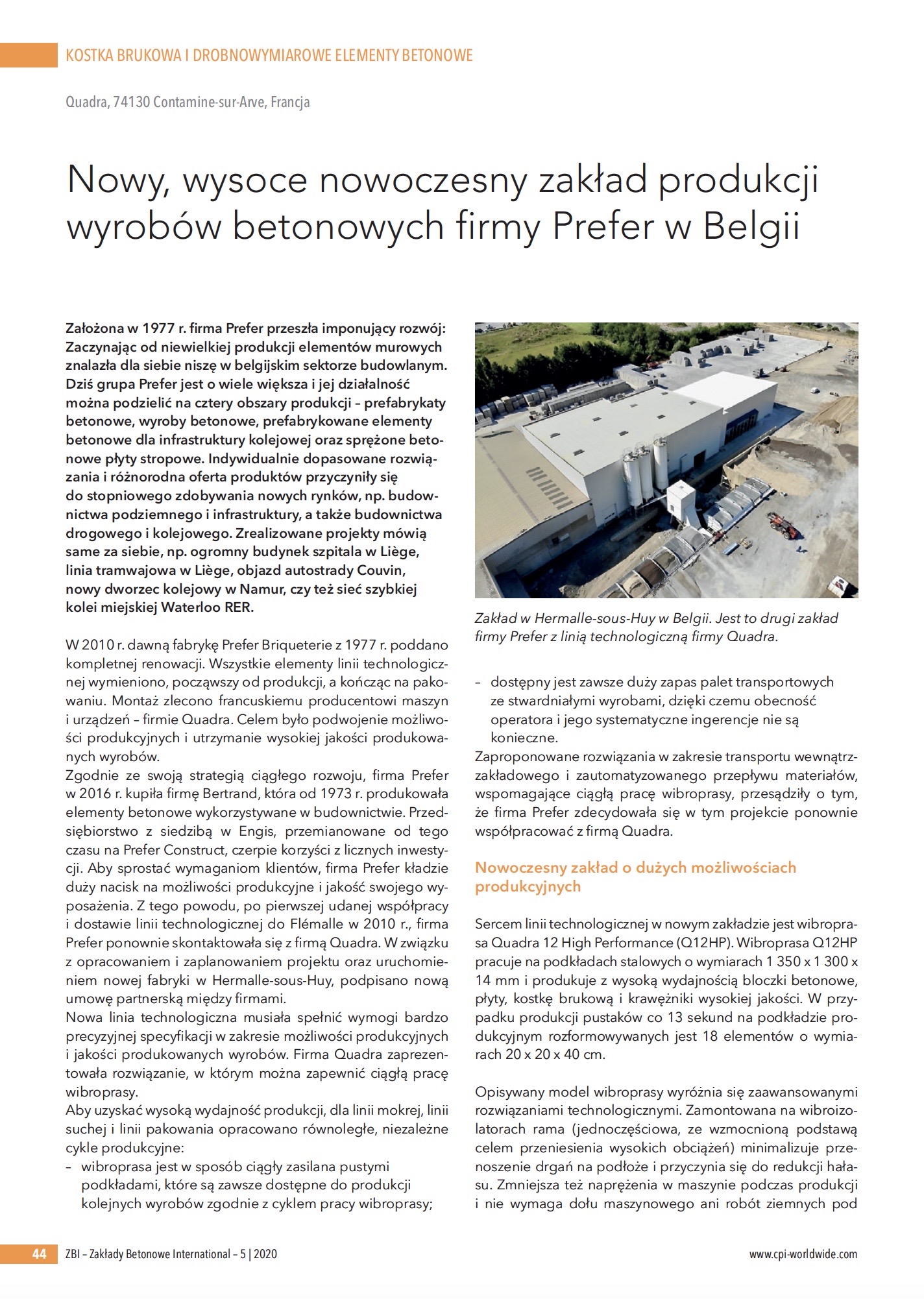 Udana współpraca z w zakresie dostawy i montażu linii technologicznej do zakładu Prefer w belgijskim Flemale w 2010 roku zaowocowała w 2017 roku nowym zleceniem dla Quadry. Zakres umowy z belgijskim producentem wyrobów prefabrykowanych obejmował tym razem przygotowanie projektu i uruchomienie linii produkcyjnej w fabryce w Hermalle-sous-Huy. Jednym z warunków udziału w projekcie była możliwość zapewnienia ciągłej pracy wibroprasy w celu zagwarantowania określonych możliwości produkcyjnych i jakościowych produkowanych wyrobów.