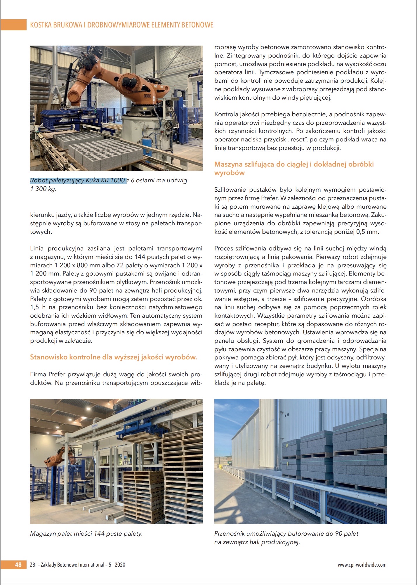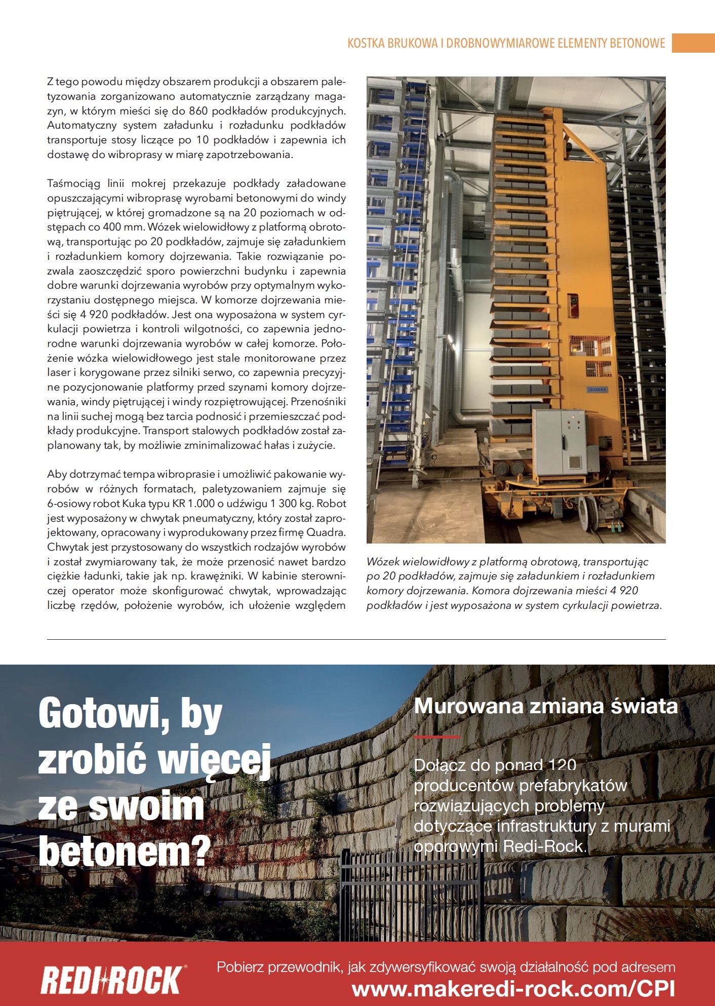 Zapewnienie wysokiej wydajności produkcji wymagało opracowania niezależnych równoległych cykli produkcyjnych dla linii mokrej, suchej i linii pakowania. Kluczowe przy wyborze dostawcy urządzeń były wysoka wydajność zaproponowanej wibroprasy oraz rozwiązania w zakresie transportu wewnątrzzakładowego i zautomatyzowanego przepływu materiałów wspomagające ciągłą pracę urządzenia.